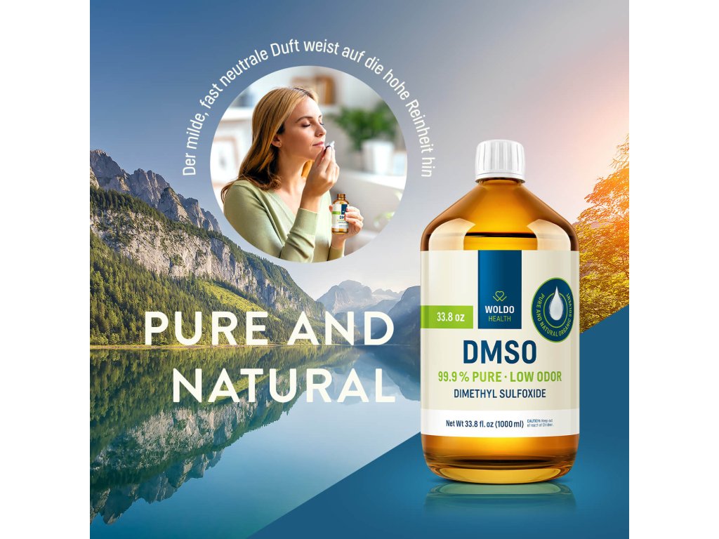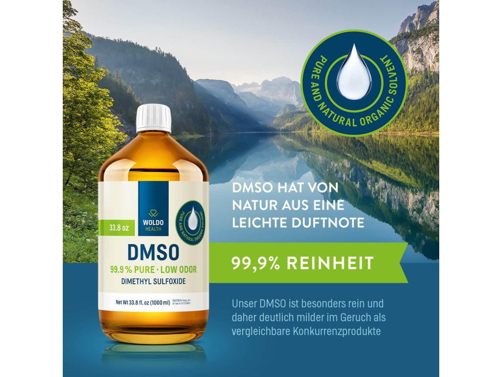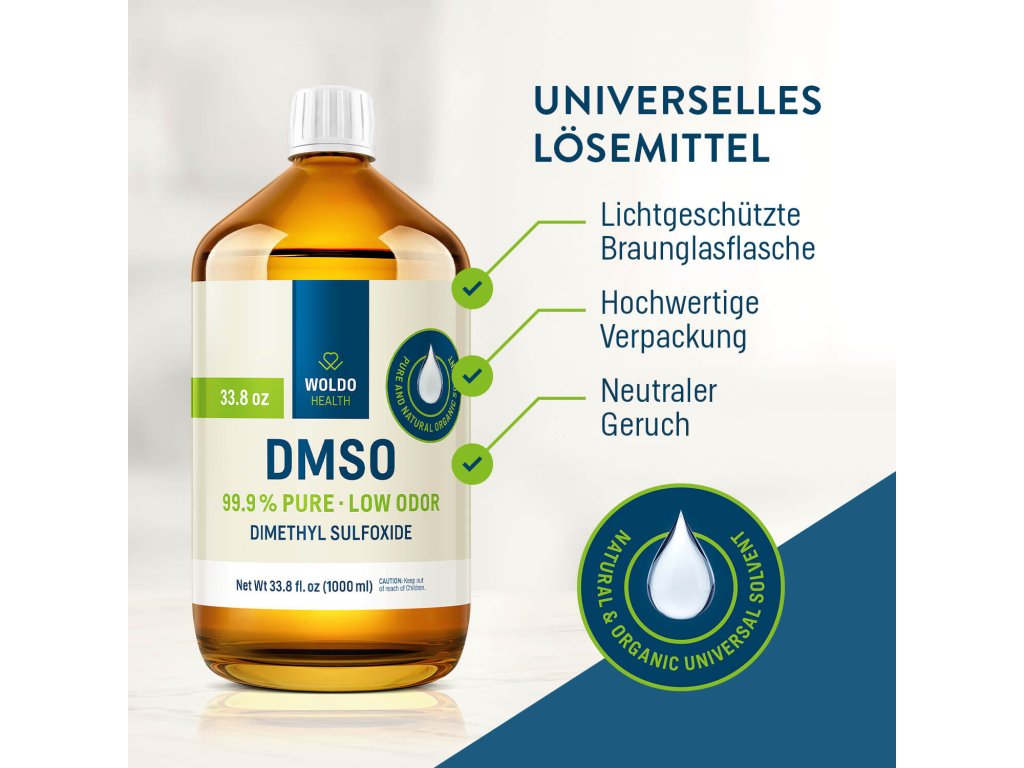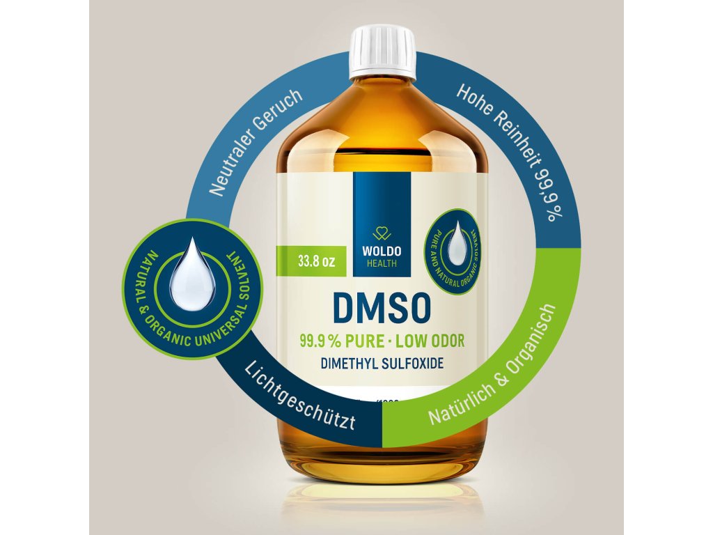 DMSO pochodzi z żywicy drzewnej i jest między innymi znane jako rozpuszczalnik. Dzięki bardzo dobrym właściwościom i wszechstronnemu zastosowaniu produkt jest często rozcieńczany wodą lub innymi roztworami wodnymi. Organiczny rozpuszczalnik dostarczany jest w butelce 250 ml. W butelce z brązowego szkła dimetylosulfotlenek jest chroniony przed światłem i ma czystość 99,9%. DMSO może być również stosowane jako nośnik w celu wzmocnienia działania substancji czynnych w kremach przeciwbólowych lub olejkach eterycznych.