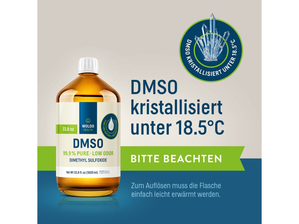 DMSO jakość farmaceutyczna 99,9%. Dimetylosulfotlenek jest certyfikowany zgodnie z normą europejską (pharma. Qualität EU-Norm). Krystalizuje w sposób terapeutyczny w temperaturze poniżej 18,5°C i twardnieje. Naturalna substancja chemiczna jest organicznym rozpuszczalnikiem pozyskiwanym z drewna.