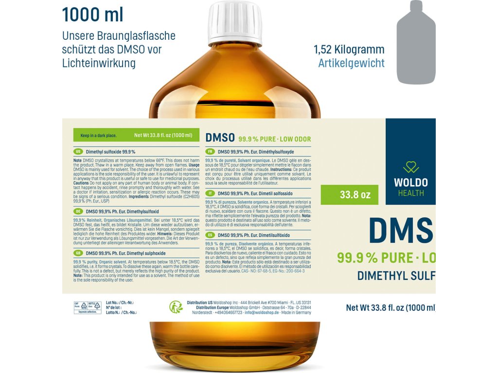 WoldoHealth DMSO jest dostarczane w butelce z brązowego szkła, chroniącej przed światłem. Dzięki zakraplaczowi rozpuszczalnik można łatwo dozować i rozcieńczać w różnych proporcjach w zależności od zastosowania.