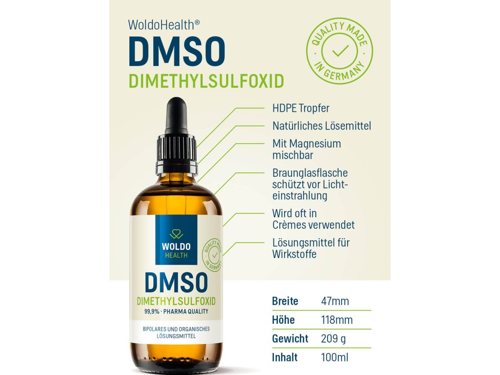 DMSO jest pozyskiwane z żywicy drzewnej i jest między innymi znane jako rozpuszczalnik. Dzięki bardzo dobrym właściwościom i wszechstronnemu zastosowaniu produkt często jest rozcieńczany wodą lub innymi roztworami wodnymi. Organiczny rozpuszczalnik dostarczany jest w butelce 100 ml z praktycznym dozownikiem. W butelce z brązowego szkła dimetylosulfotlenek jest chroniony przed światłem i ma czystość 99,9%. DMSO może być również stosowane jako nośnik w celu wzmocnienia działania substancji czynnych w kremach przeciwbólowych lub olejkach eterycznych.