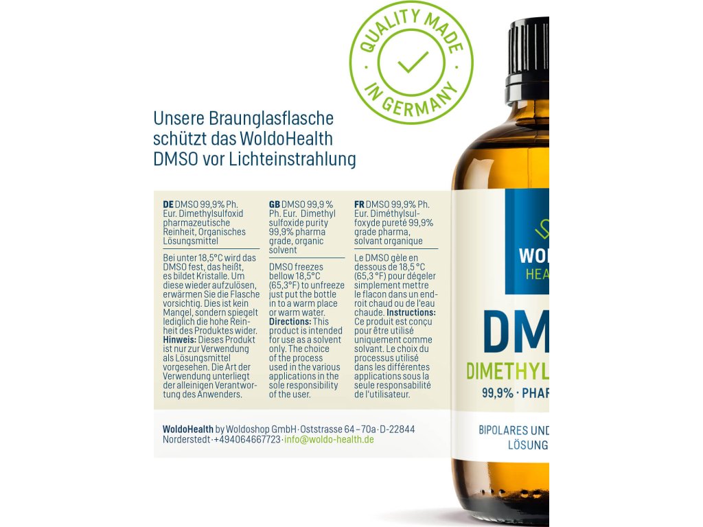 WoldoHealth DMSO jest dostarczane w butelce z brązowego szkła chroniącej przed światłem. Do rozpuszczalnika nadaje się praktyczny dozownik z tworzywa HDPE. Dzięki zakraplaczowi rozpuszczalnik można łatwo dozować i rozcieńczać w różnych proporcjach w zależności od zastosowania.