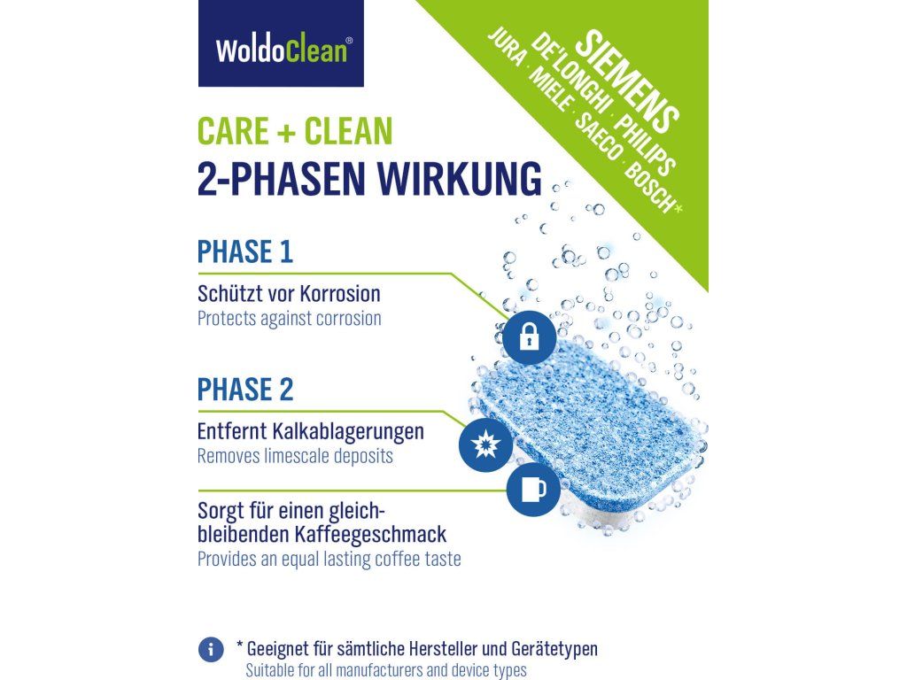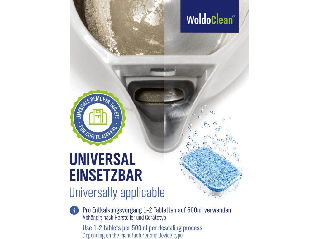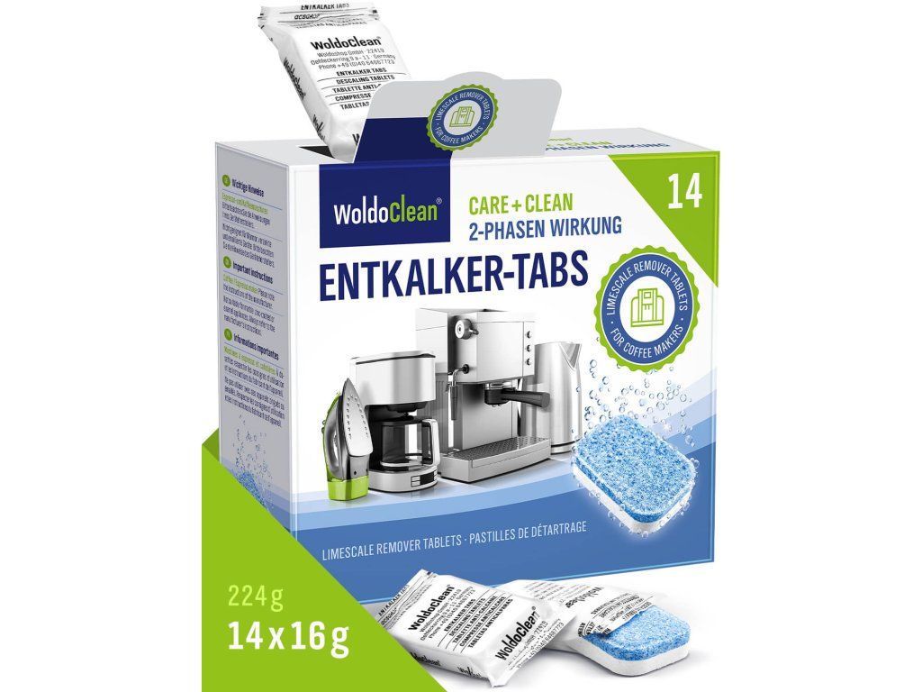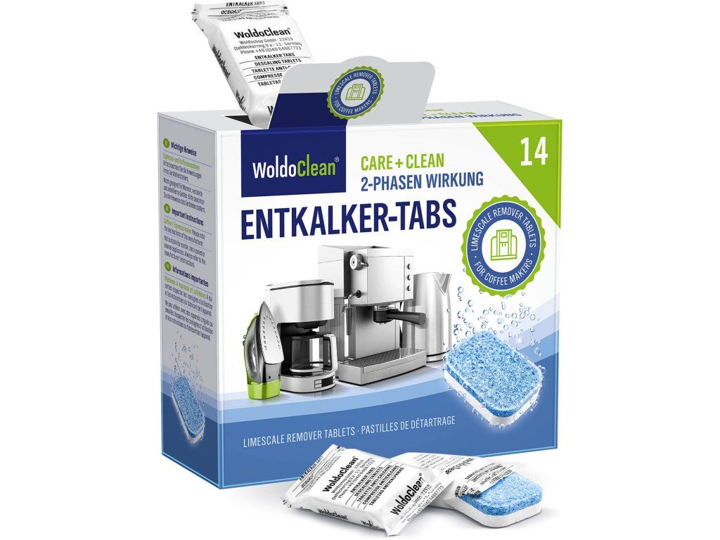 Wysoce skuteczne dwufazowe tabletki odkamieniające WoldoClean w praktycznym opakowaniu 14 szt. są idealne do regularnej konserwacji automatycznych i kolbowych ekspresów do kawy. Dwufazowa formuła zapewnia dokładne usunięcie kamienia i jednocześnie długotrwałą ochronę antykorozyjną.