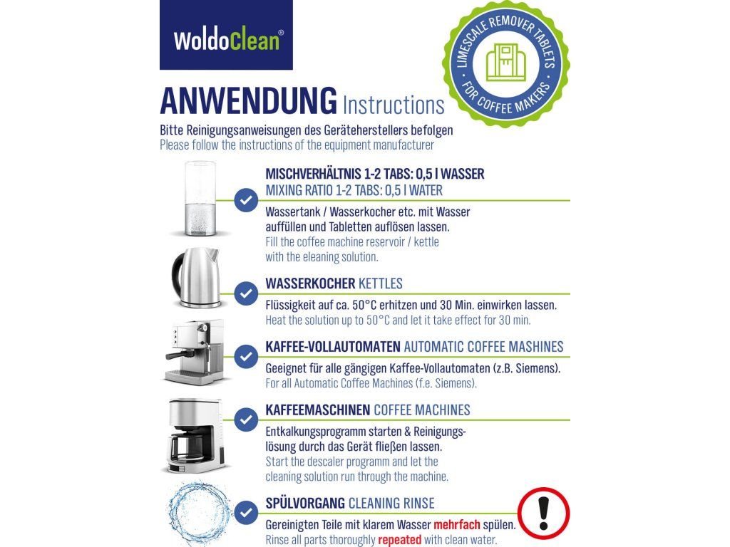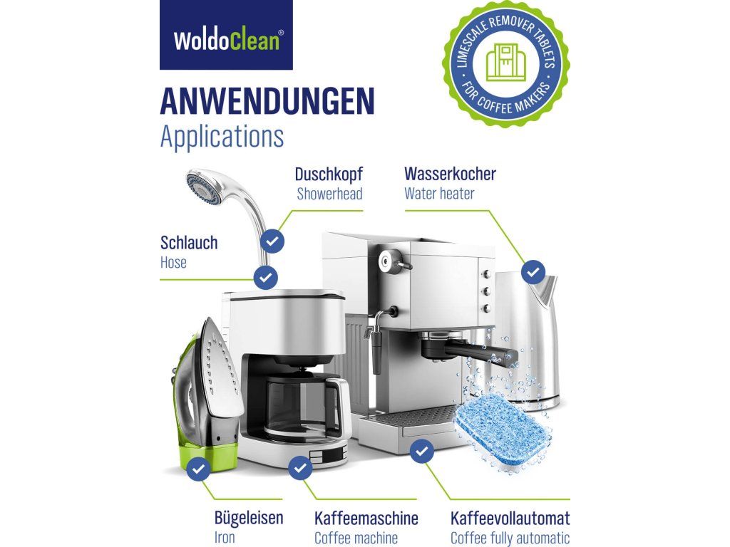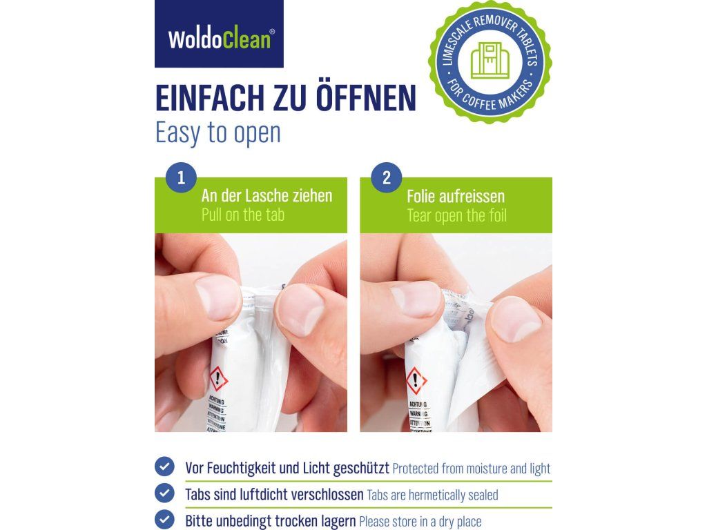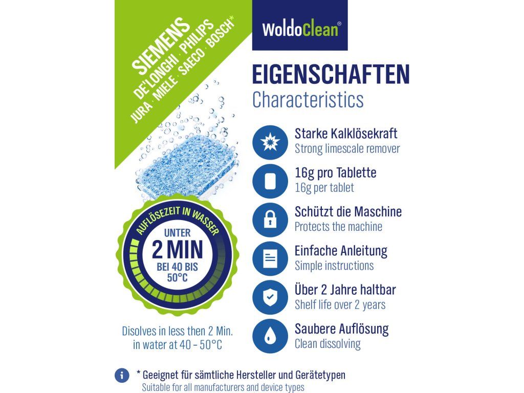 Wysoce skuteczne dwufazowe tabletki odkamieniające WoldoClean w praktycznym opakowaniu 14 szt. są idealne do regularnej konserwacji automatycznych i kolbowych ekspresów do kawy. Dwufazowa formuła zapewnia dokładne usunięcie kamienia i jednocześnie długotrwałą ochronę antykorozyjną.