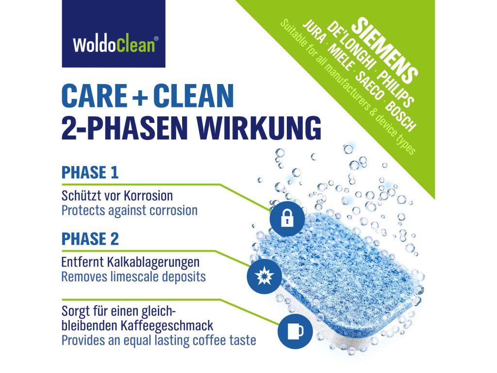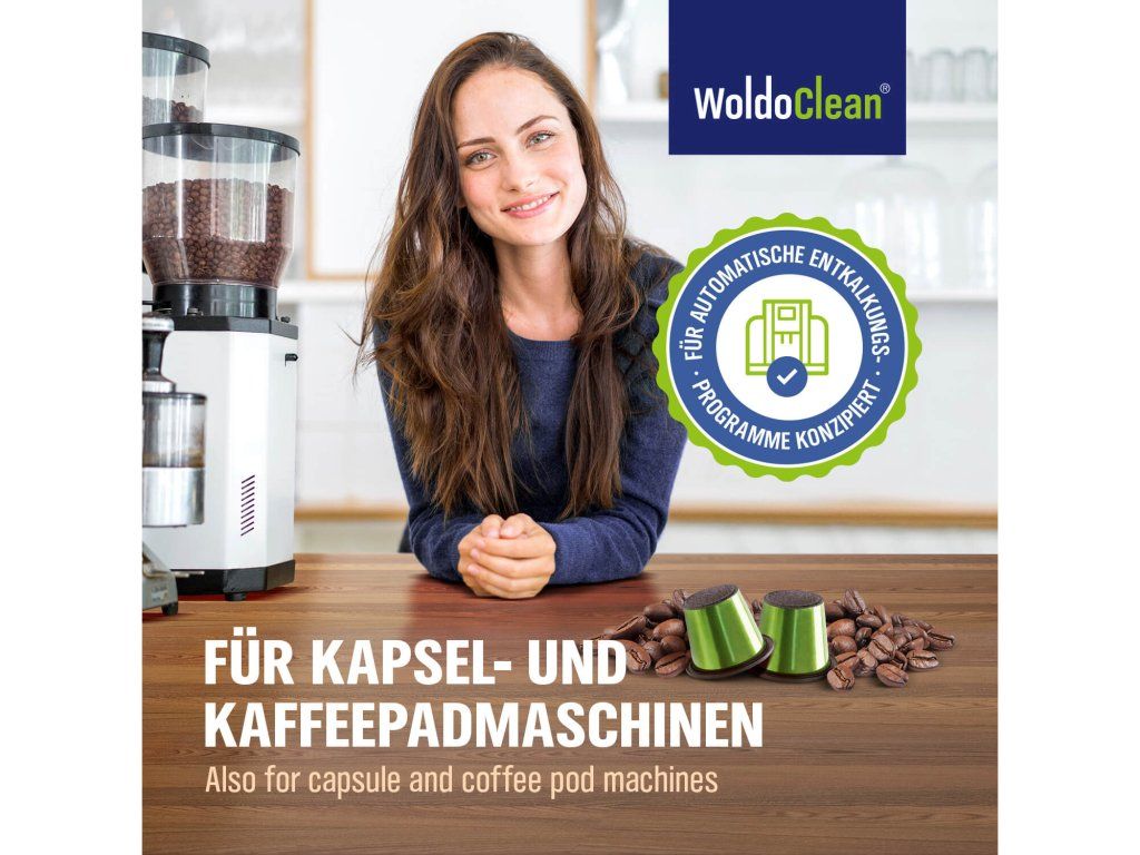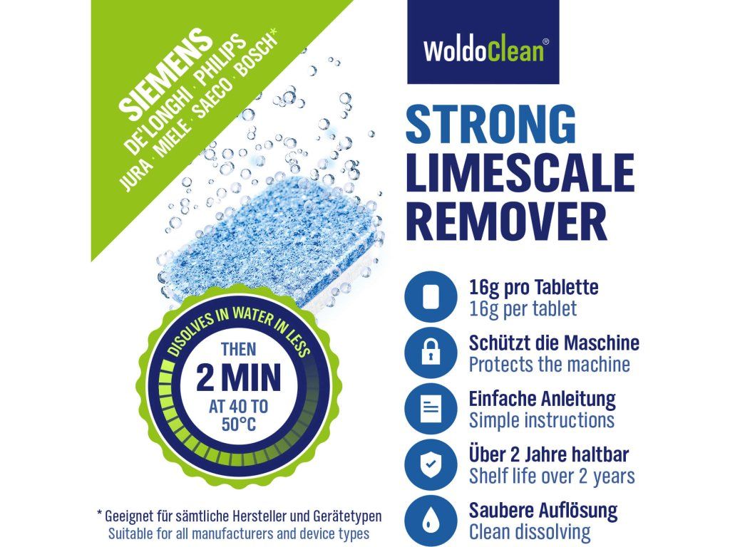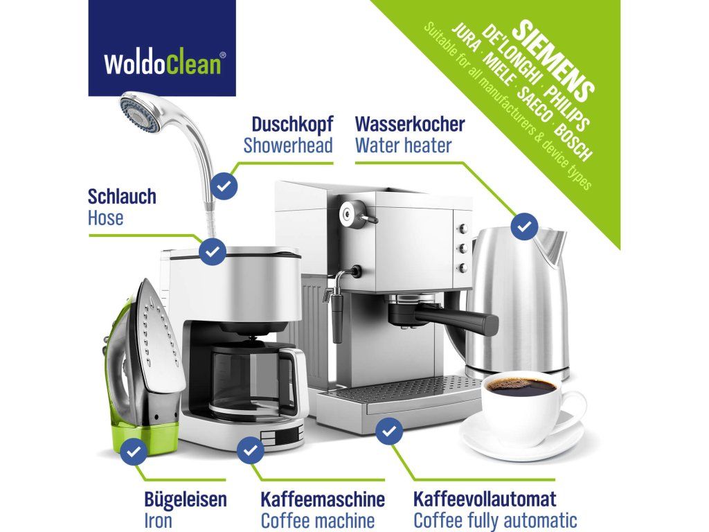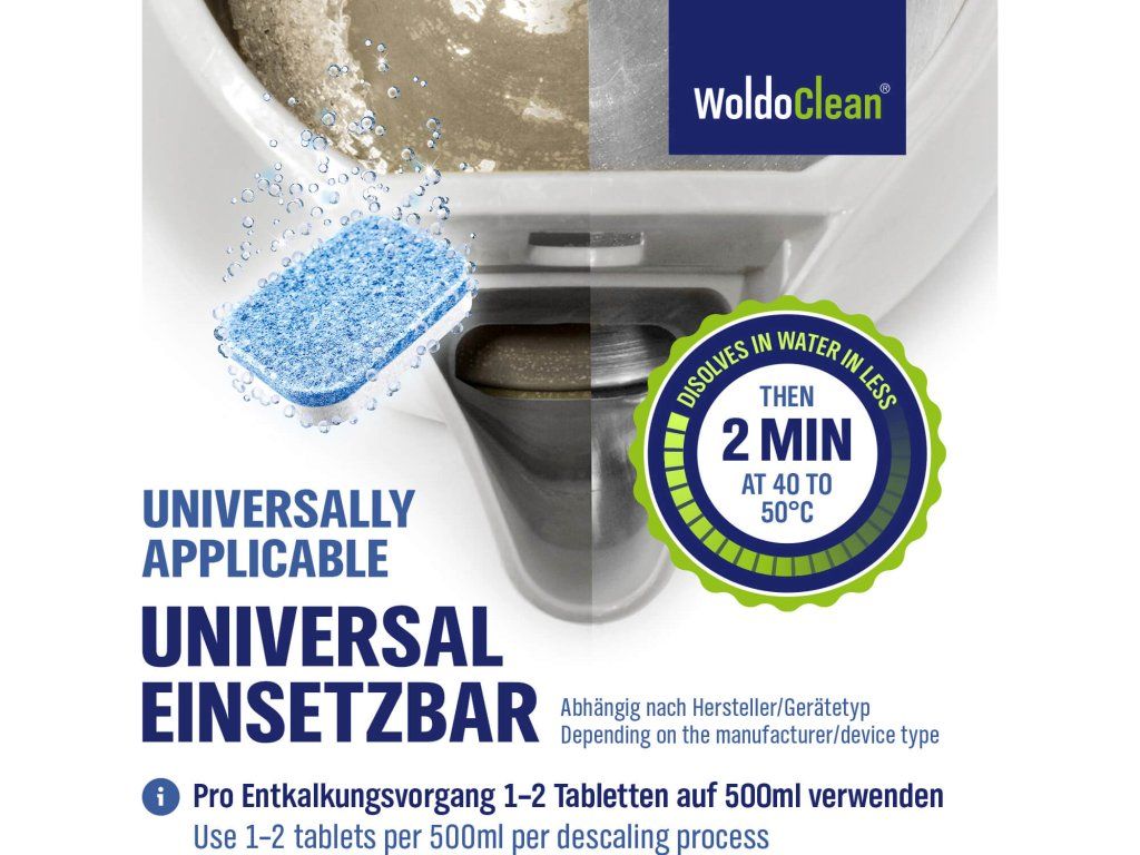 Dwufazowe tabletki odkamieniające WoldoClean to innowacyjne rozwiązanie do delikatnego, a zarazem bardzo skutecznego usuwania kamienia z ekspresów do kawy, czajników i innych urządzeń kuchennych. Dzięki dwustopniowemu działaniu najpierw rozpuszczają osady, a następnie zapewniają długotrwałą ochronę antykorozyjną. Odpowiednie dla marek Jura, Siemens, Delonghi, Philips, Bosch, Tassimo, Dolce Gusto i innych.