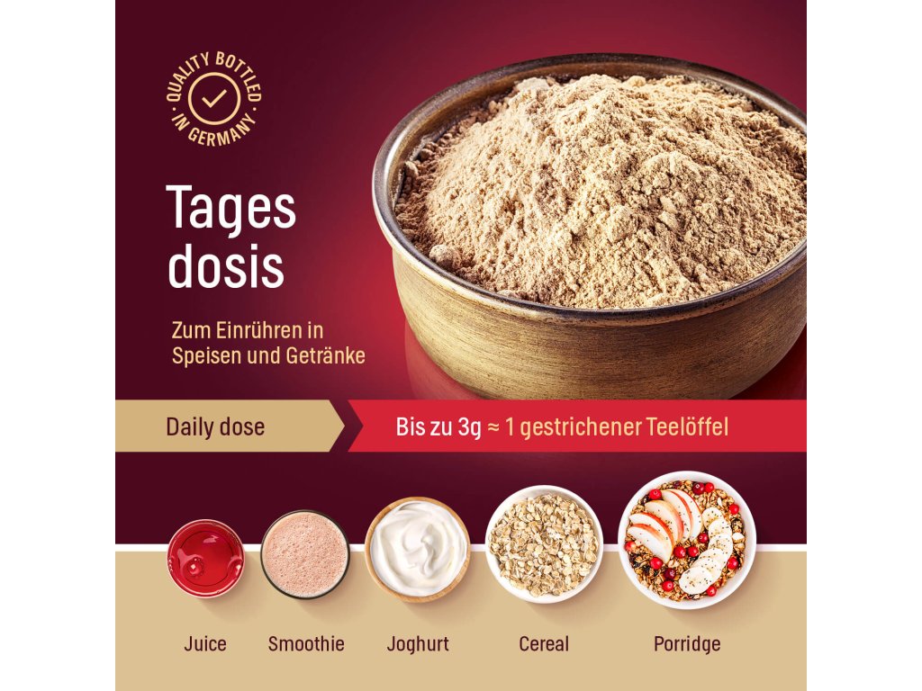 | Doporučené denní dávkování: | Denně se doporučuje konzumovat 1 kávovou lžičku, tedy přibližně 3 g maca prášku. |