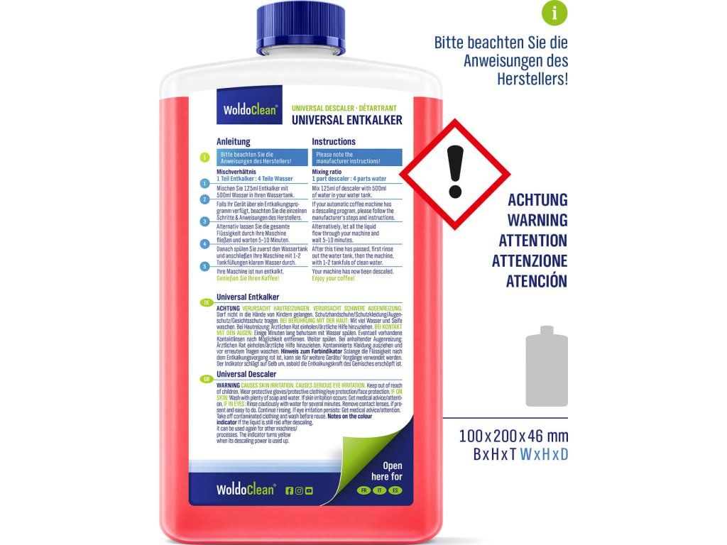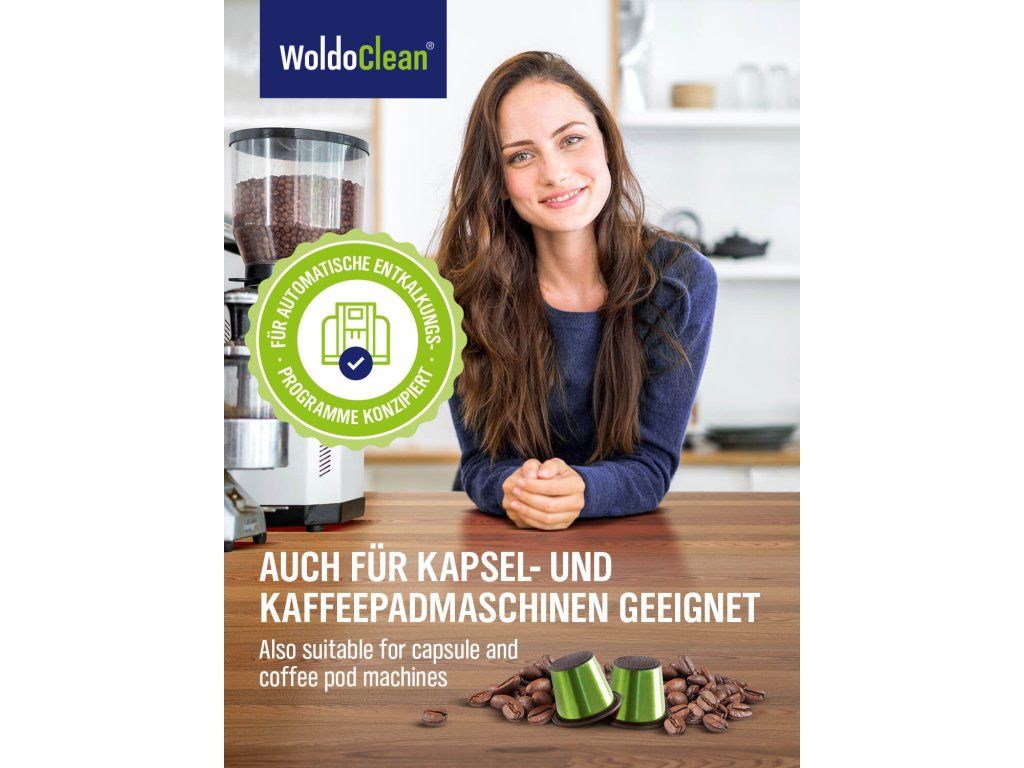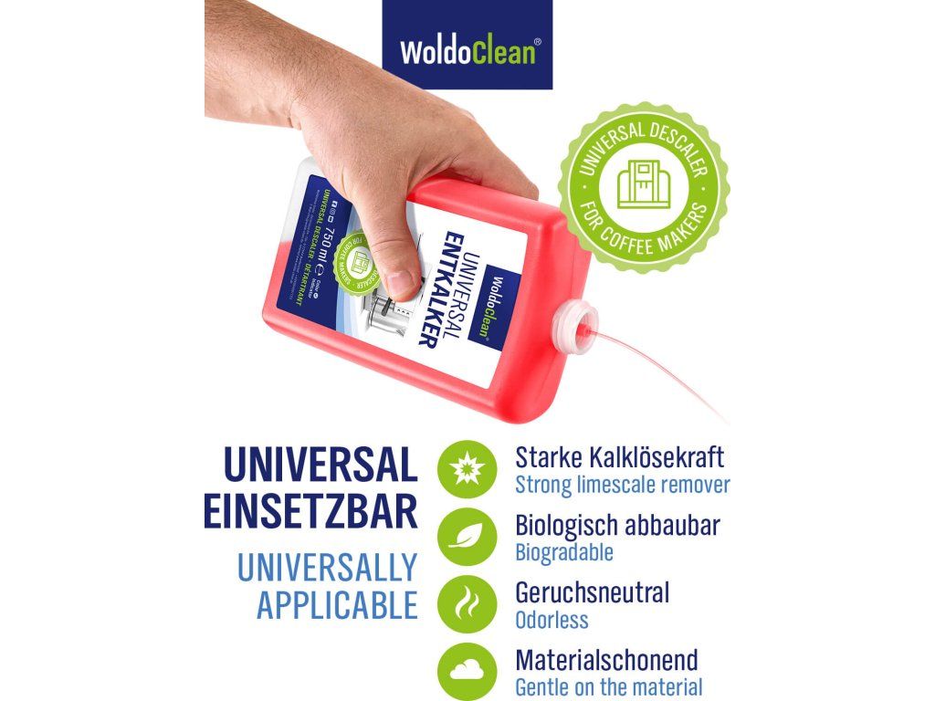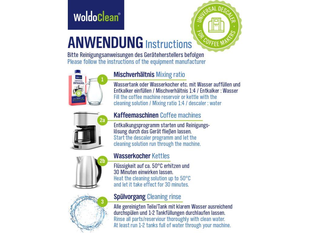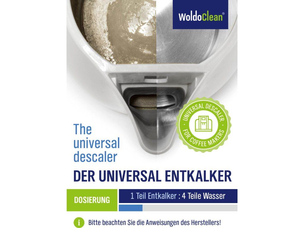 Wysoce skuteczny odkamieniacz WoldoClean skutecznie rozpuszcza osady wapienne i kamień kotłowy w ekspresach do kawy, czajnikach, ekspresach kolbowych i innych urządzeniach. Idealny do użytku domowego i profesjonalnego.