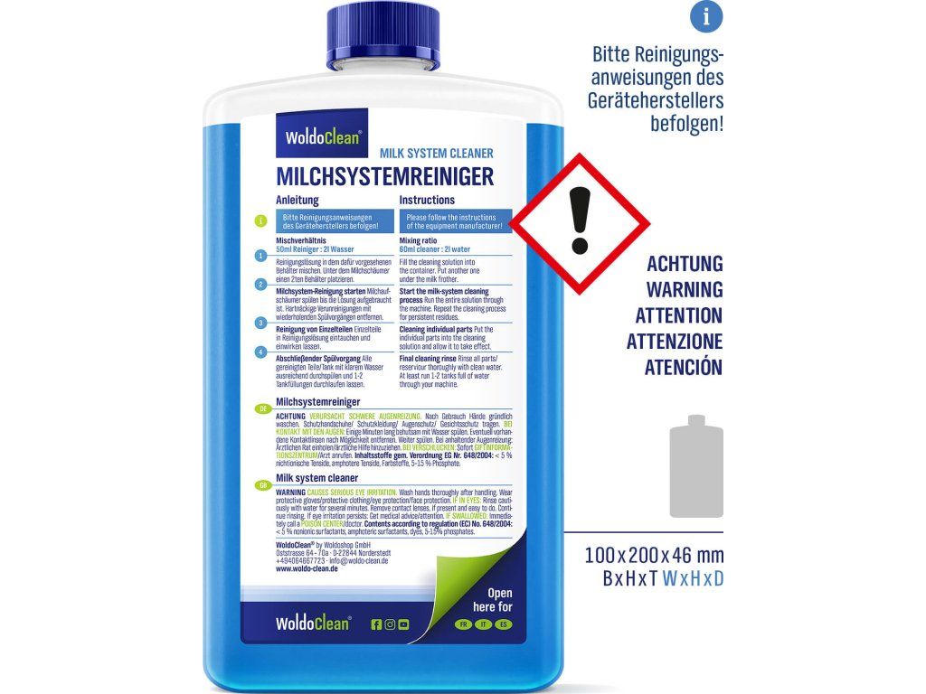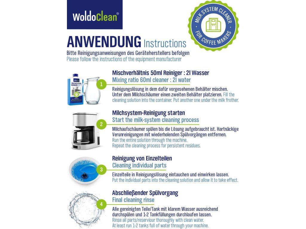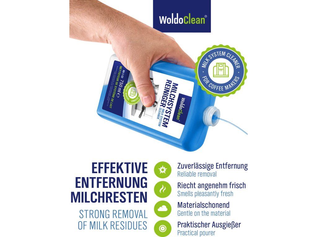 WoldoClean Środek czyszczący do osadów mlecznych to idealne rozwiązanie do dokładnego i delikatnego czyszczenia systemów mlecznych w ekspresach w pełni automatycznych, kolbowych oraz kapsułkowych. Skutecznie usuwa resztki mleka, tłuszczu i białka z dysz, przewodów i pojemników na mleko.