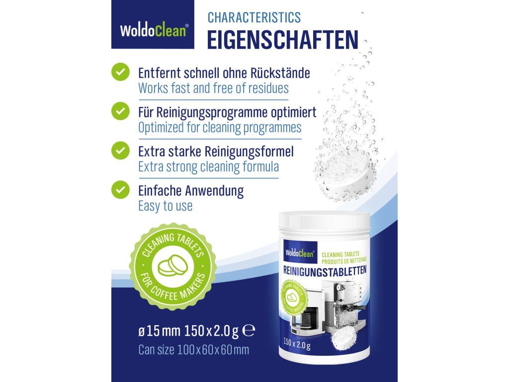 Tabletki skutecznie usuwają tłuszcze kawowe, oleje i osady, które gromadzą się wewnątrz ekspresu i mogą obniżać jakość przygotowywanego napoju. Są kompatybilne z większością marek, w tym Jura, Siemens, Philips, Bosch, DeLonghi, Saeco, Nespresso, WMF, Krups, Miele, Melitta i innymi.