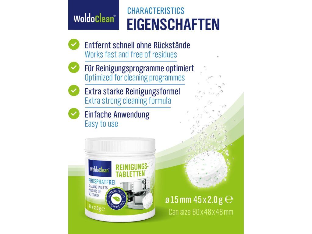 Tabletki czyszczące WoldoClean bez fosforanów w opakowaniu 45 szt. to idealny wybór do codziennej domowej konserwacji automatycznych, kolbowych i kapsułkowych ekspresów do kawy. Delikatny skład na bazie sodu czyści skutecznie, a jednocześnie jest przyjazny dla środowiska.