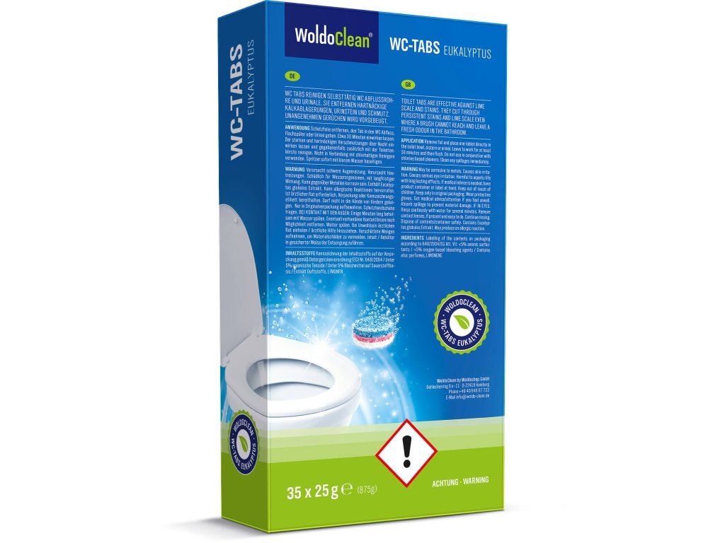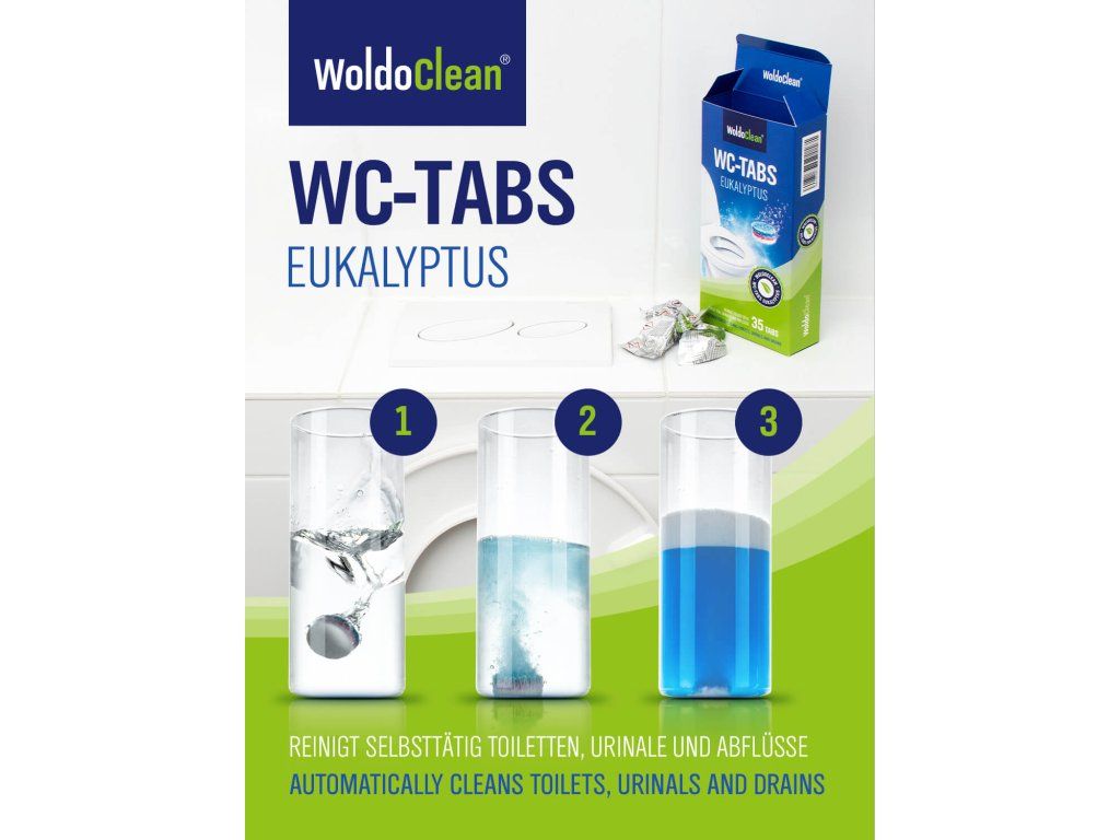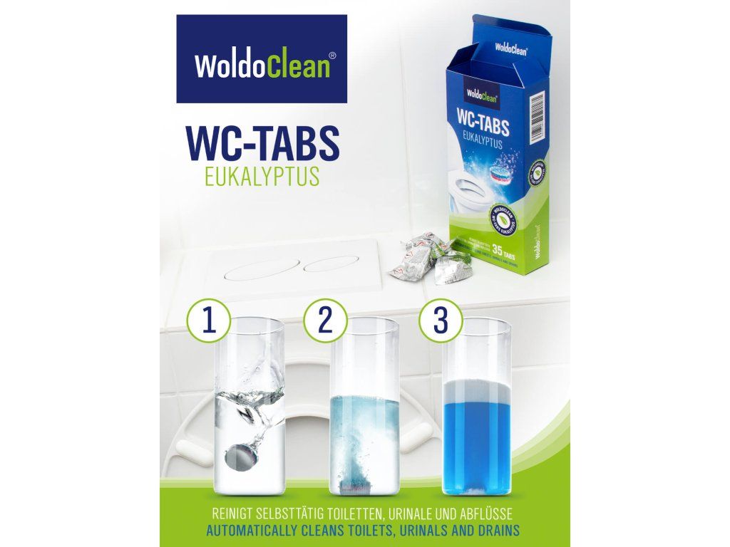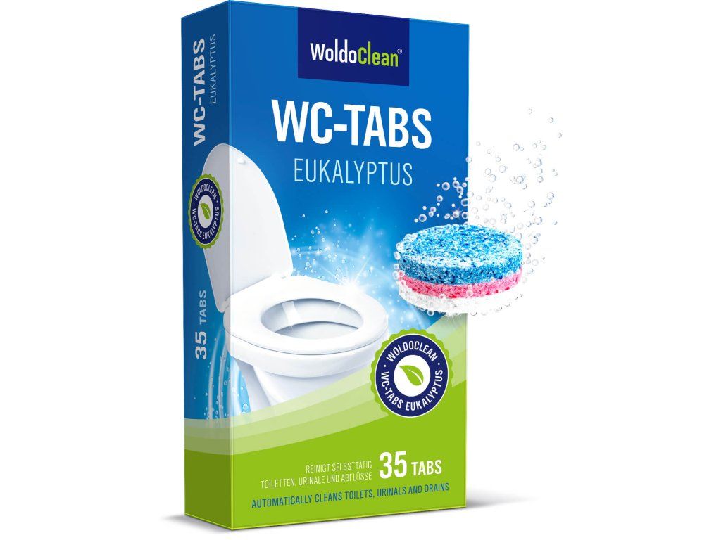 WoldoClean tabletki czyszczące do toalety zapewniają intensywne i automatyczne czyszczenie wnętrza muszli klozetowej oraz rur odpływowych. Usuwają osady wapienne, plamy z moczu oraz zanieczyszczenia organiczne.